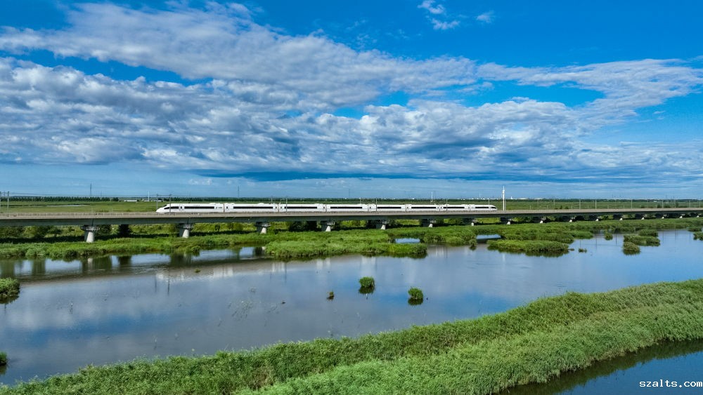 8月17日,一列动车组列车正行驶在哈齐高铁线上(无人机照片)。新华社发(原勇摄)